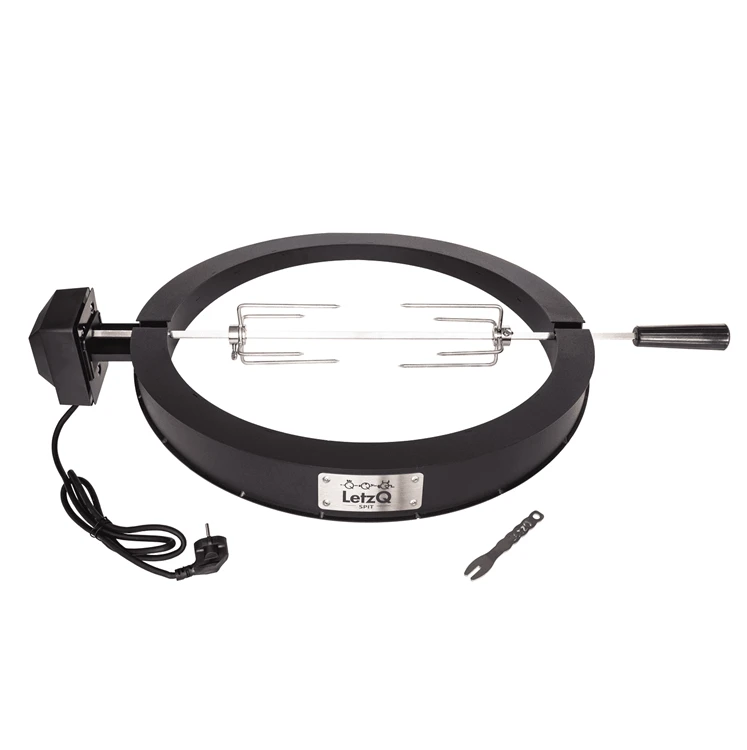 LetzQ spit is voorzien van een RVS draai spit, verstelbare vorken en een 4 watt elektrische motor. De motor is krachtig genoeg om meerdere kippetjes of steaks tegelijktijd te grillen.Â