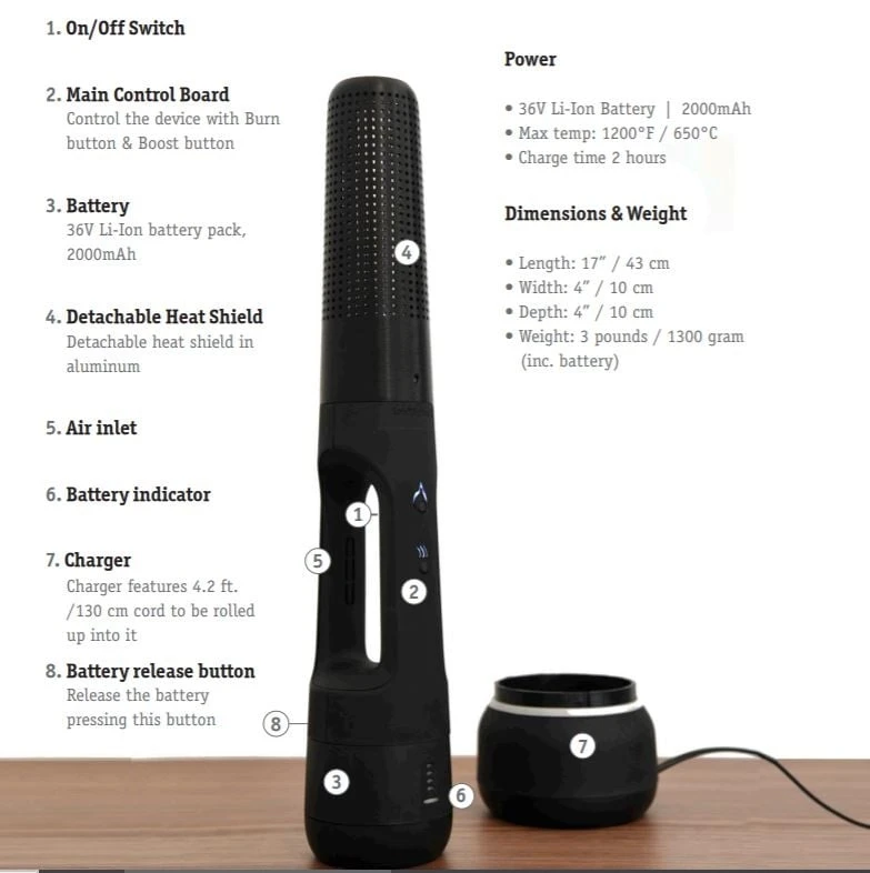Start het vuur tot 15 keer met een oplaadtijd van 1 uur Normale oplaadtijd 2 uur Verwisselbaar hitteschild Indicator batterijlading Automatisch ontstekingsprogramma Max. Temperatuur 650 ° C