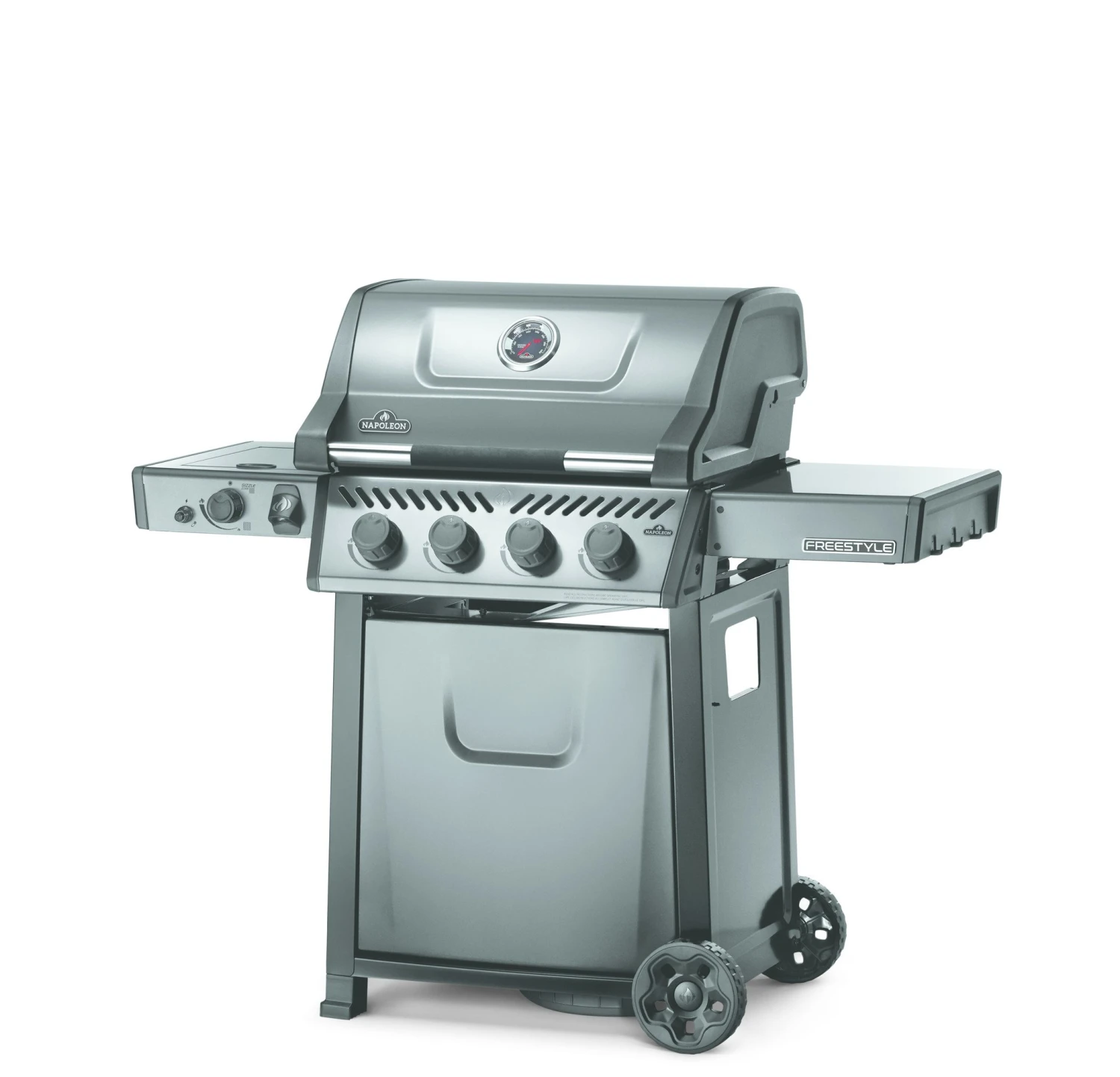 De Freestyle 425 propaangasbarbecue met SIZZLE ZONEâ„¢ infrarood zijbrander is een compacte grill met premium functies en een onklopbare prijs. Met betrouwbare JETFIRE-ontsteking waarmee de hoofdbranders probleemloos met een eigen, krachtige ontstekingsvlam worden aangestoken. Schroei het vlees perfect dicht boven de gietijzeren grillroosters met porseleincoating. Vier RVS branders bieden gelijkmatige warmte die eenvoudig geregeld kan worden en gecontroleerd met de ingebouwde thermometer. Schroei etenswaren dicht alsof het in een restaurant is gedaan of bereid zijgerechten tijdens het grillen met de infrarode zijbrander en het aanzetstation. Dankzij de robuuste wielen kan deze barbecue overal naartoe worden gereden, waar hij maar nodig is, terwijl de eenvoudig inklapbare zijtafels met gereedschapshouders en flessenopener ervoor zorgen dat de Freestyle bij uw levensstijl en ruimte past.