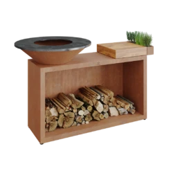 Deze alles-in-één buitenkeuken combineert een unieke stijl en functionaliteit in een compact ontwerp. Het bestaat uit een OFYR kooktoestel met houtopslag, een stevig snijblok en een praktische houder voor keukengerei en kruiden. Verkrijgbaar in de diameters 85 cm en 100 cm, uitgevoerd in cortenstaal. Het snijblok is verkrijgbaar in Teakhout en donkergrijs keramiek.
